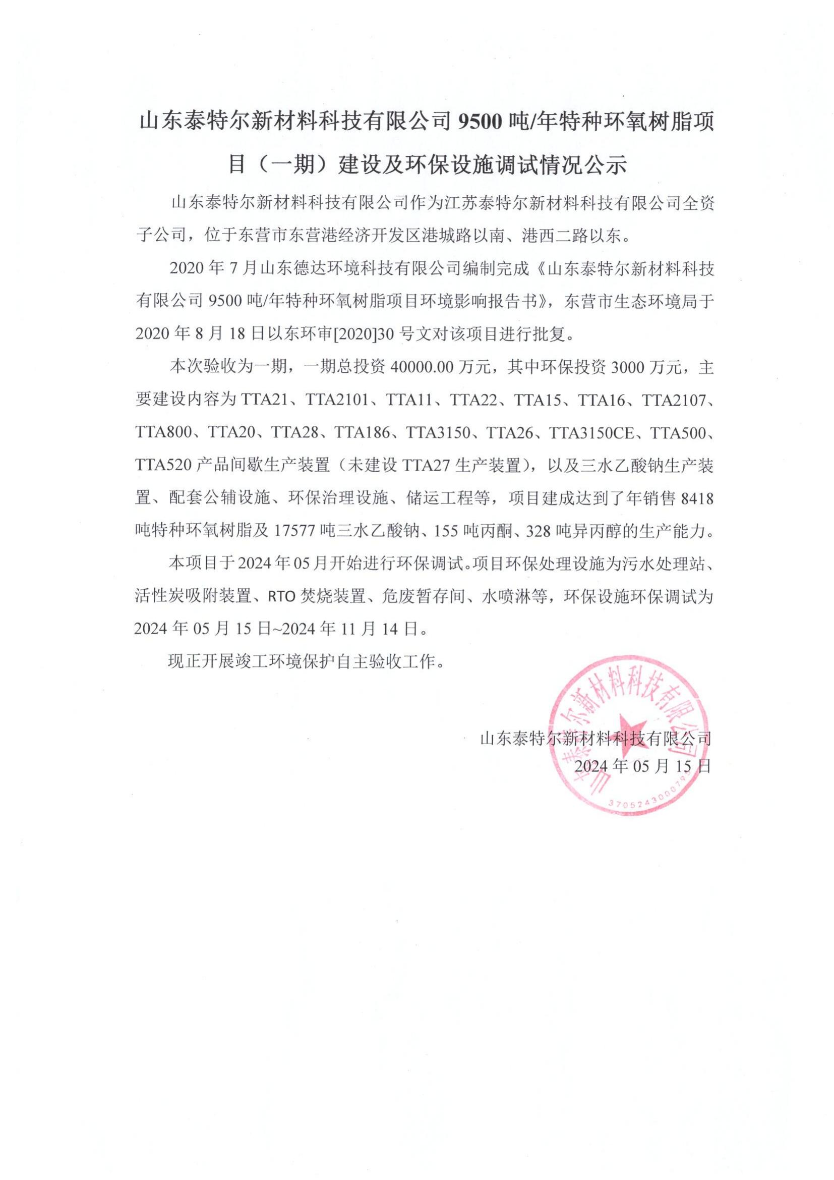 山東泰特爾新材料科技有限公司9500噸/年特種環氧樹脂項目(一期)建設及環保設施調試情況公示