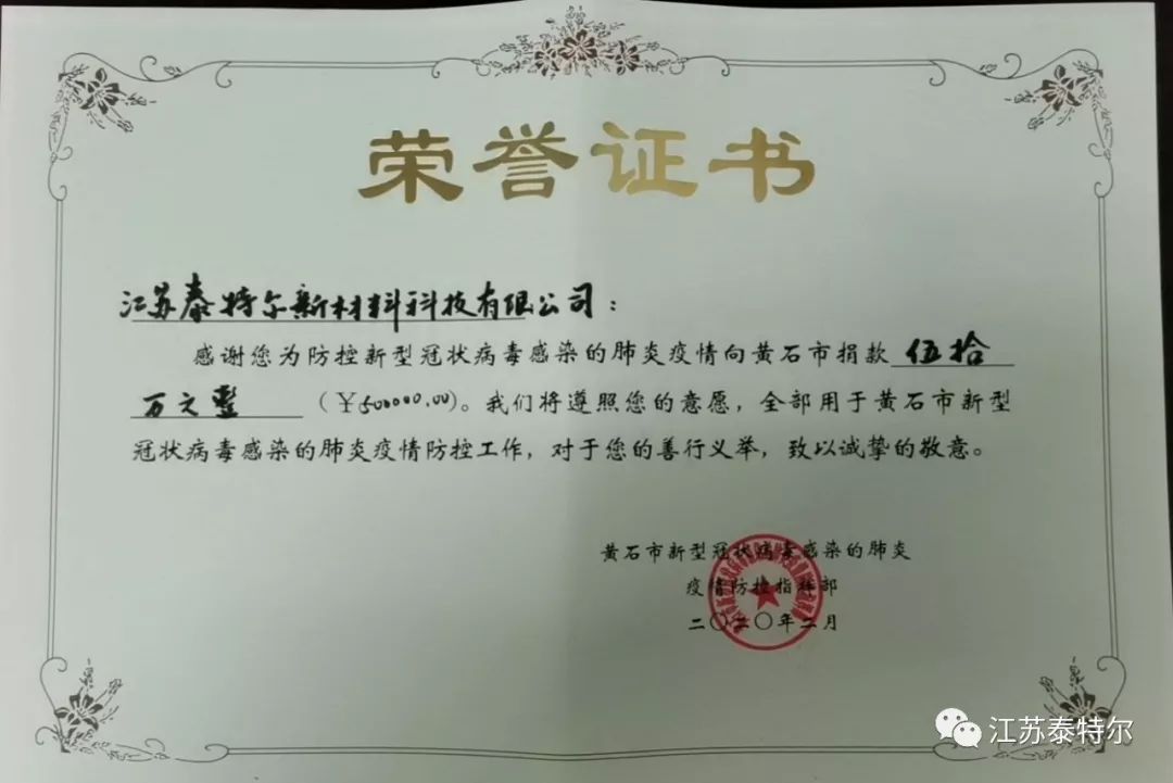 新型冠狀病毒肺炎爆發(fā),以武漢為中心迅速向周邊蔓延,目前疫情已蔓延至全國(guó)各省,面對(duì)這場(chǎng)突如其來的疫情,江蘇泰特爾新材料科技有限公司緊急決定向黃石市慈善總會(huì)捐贈(zèng)人民幣50萬元,為防控疫情貢獻(xiàn)應(yīng)有之力。