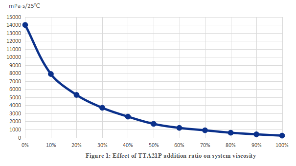 3.2 Conclusion: As shown in Figure 1, with the increase of TTA21P addition ratio, the system viscosity decreases rapidly, which reflects the obvious dilution effect of TTA21P.