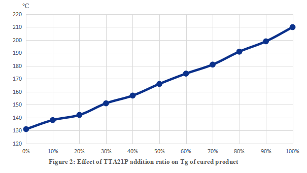 4.2 Conclusion: As shown in Figure 2, with the increase of TTA21P addition ratio, Tg value of the cured product increases significantly, which reflects that TTA21P can improve the heat resistance of the material significantly.