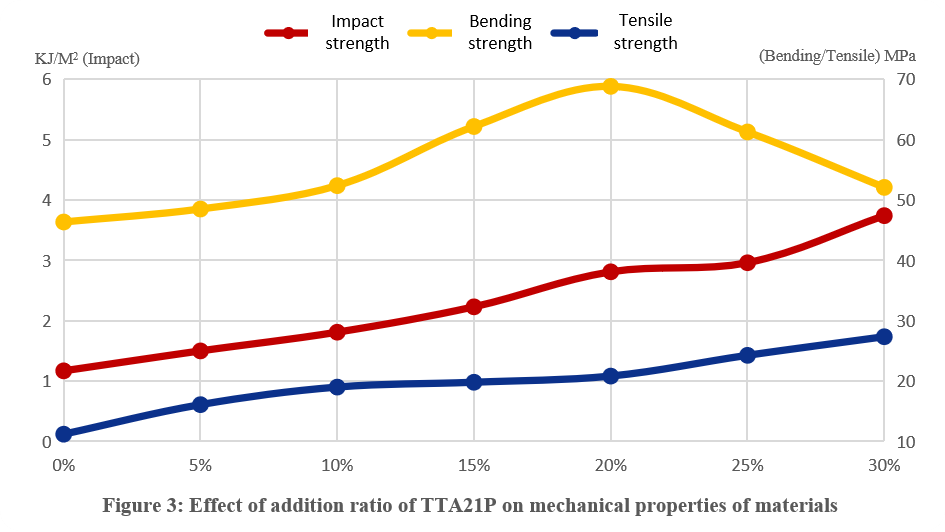 5.2 Conclusion: When the addition ratio of TTA21P increases gradually within the range of 0%~30%, the impact strength and tensile strength of the material increase continuously, while the bending strength increases first and then decreases (peaking at about 20%).